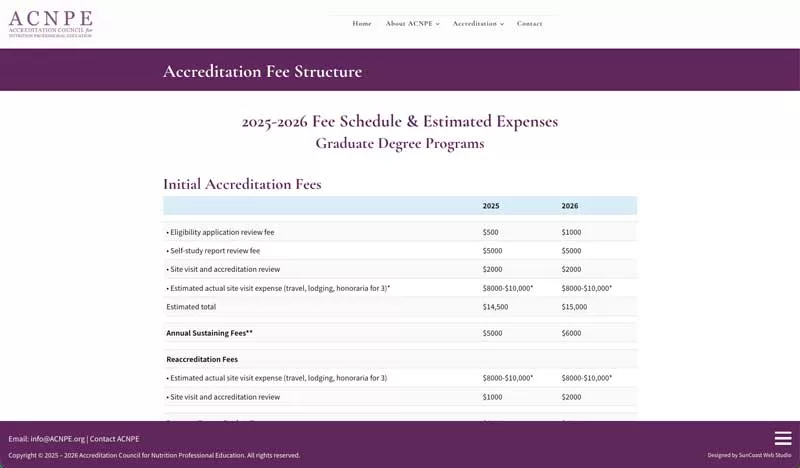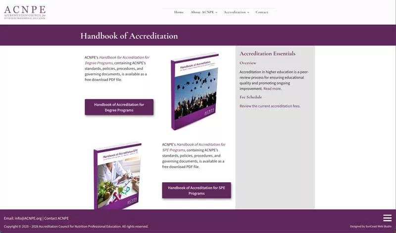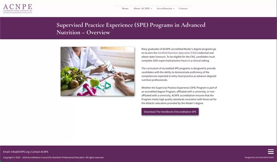 SunCoast Web Studio designed and developed a redesigned website for ACNPE, the Accreditation Council for Nutrition Professional Education. The organization accredits Master’s-degree and Supervised Practice Experience (SPE) programs in clinical nutrition, with a focus on functional and personalized nutrition as an applied healthcare science.
