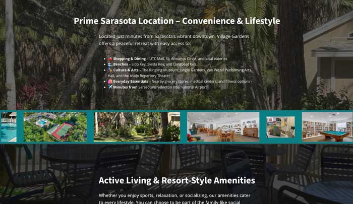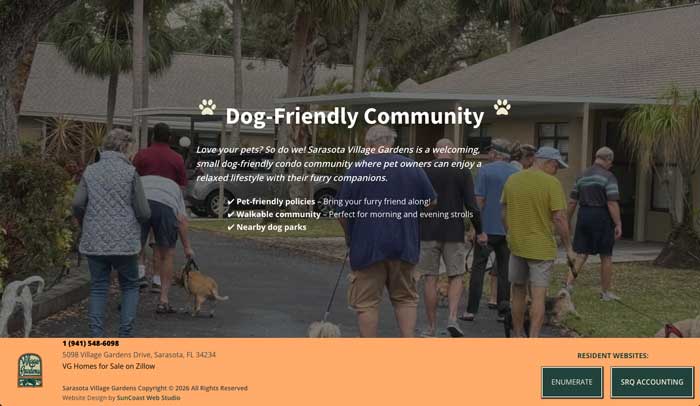 Sarasota Village Gardens is a residential community in Sarasota, Florida that needed a simple, effective website designed to improve online visibility while serving as a practical resource for residents and prospective buyers. SunCoast Web Studio created a clean, mobile-friendly one-page website that makes the community easy to find on Google and easy to navigate for everyday use. The site highlights key amenities, provides quick-access links for residents, and includes direct links to current Zillow listings—making it useful for homeowners, renters, and real estate professionals researching the community. A prominent feature of the site is an events and calendar system that allows residents to view all Village Gardens activities, including social events, clubhouse gatherings, and board meetings. A dedicated link in the top corner of the site ensures events are always easy to access, helping residents stay informed and engaged without needing to search through emails or paperwork. Designed with simplicity and clarity in mind, this project demonstrates how a well-structured one-page website can deliver strong local SEO results, improve communication, and add real value to an HOA—without unnecessary complexity or ongoing maintenance burdens.