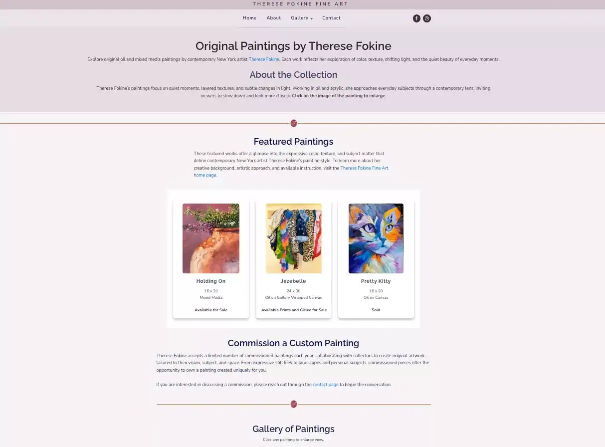 Therese Fokine is a contemporary New York artist working in oil and mixed media. She needed a clean, gallery-focused website that would highlight her paintings while remaining simple and easy to navigate. I designed a custom WordPress site that features: • Structured gallery layouts for individual artwork • SEO-optimized painting pages with descriptive metadata • Responsive design for collectors browsing on mobile • Clean typography that keeps the focus on the artwork The result is a refined online presence that reflects the quiet strength and texture of her work while making it easy for collectors to explore and inquire.